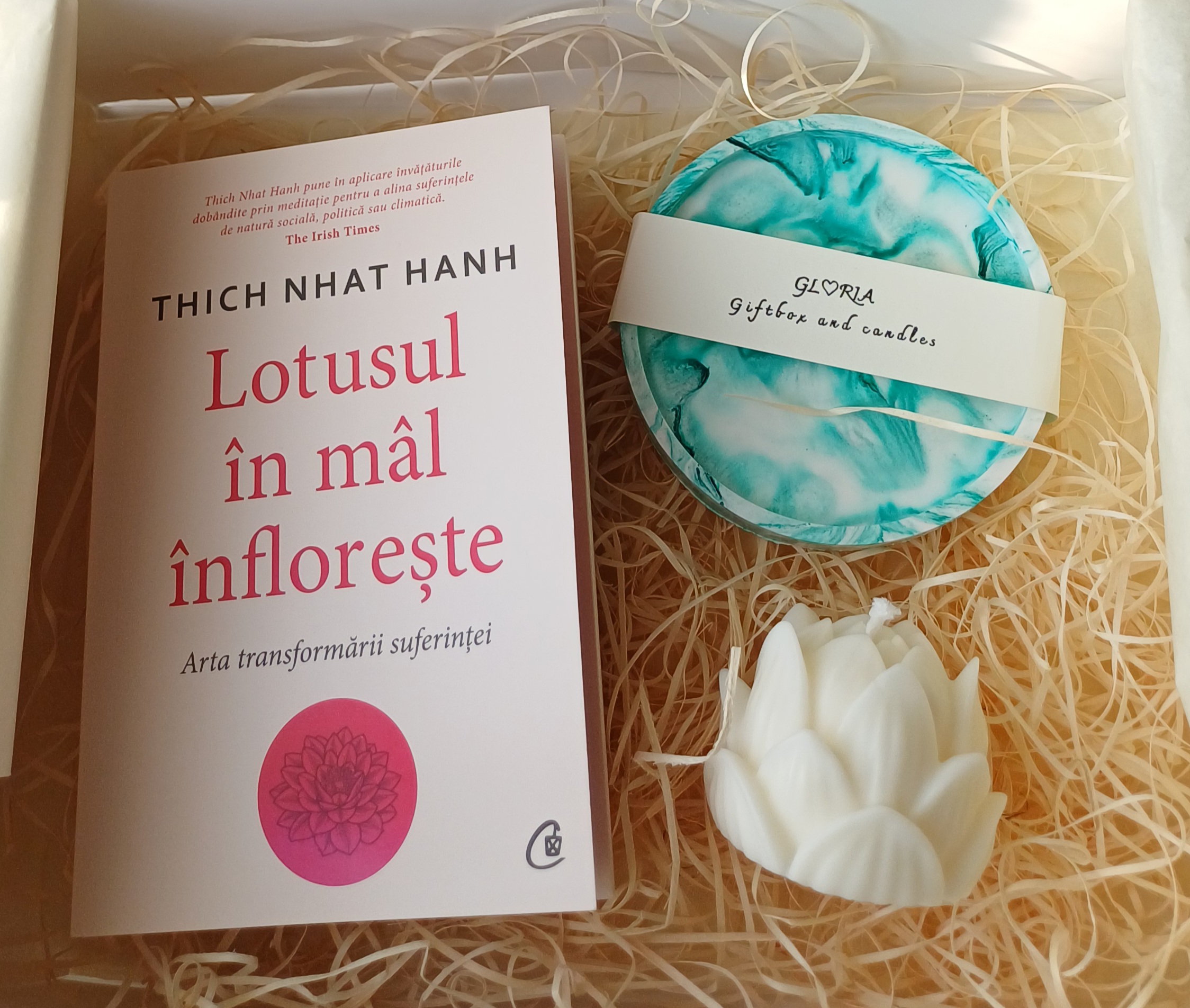 Acest cadou reunește 3 simboluri ale renașterii: o lumanare in formă de lotus, turnată cu grijă pentru a aduce liniste, un suport ceramic deosebit si cartea”Lotusul in mâl inflorește” – o invitație blandă la transformare și sens. Este un cadou despre lumina care se naște din intuneric, despre fragilitate care devine forță, despre momentele in care, chiar și din cele mai tulburi ape, sufletul alege sa inflorească.