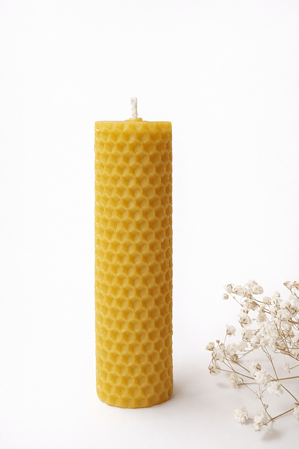Inspirată din armonia stupului, această lumânare păstrează textura autentică a fagurelui și parfumul discret al cerii de albine 100% naturale.